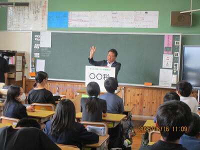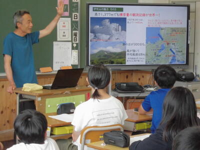 6年生がゲストティーチャー:髙橋滝治郎さんから「伊吹山の環境や歴史について」教えていただきました。伊吹山がどのような場所に位置し、そのためどのような自然現象(約100年前:積雪約11m82cm)が起こるのかなど詳しく教えていただきました。また、伊吹山の現状(鹿による植生被害など)もたくさんの画像を見せていただき学習しました。この学習したことを7月1日の登山で自分たちの目で見て学び、11月29日の「春照ふるさとフェス」で発表していく予定です。お楽しみに!!