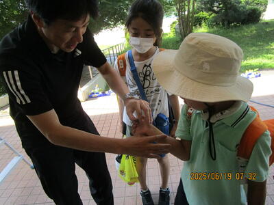 学校でも、熱中症対策の一つとして、2つある児童昇降口の前にミストシャワーを設置しています。