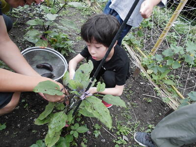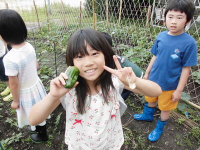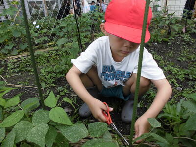 きゅうりやナス、ピーマンなどの夏野菜が実をつけ、大きくなってきたので、今日は、みんなで収穫です。