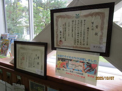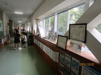 あわせて、入賞でいただいた賞状もお預かりしましたので、早速、職員室前のろうかに飾りました。
