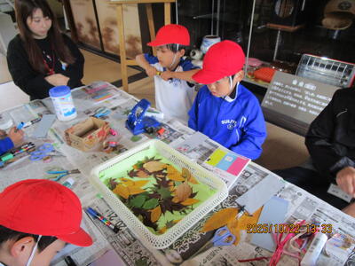 これは、秋の木の葉や木の実を使った遊び体験で、どんぐりごま、ドングリスライダー、オナモミダーツ、落ち葉のしおり作りなどを楽しみました。