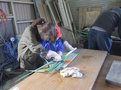 収穫した白ネギは、切って、テープで束ねて、ビニール袋へつめます。