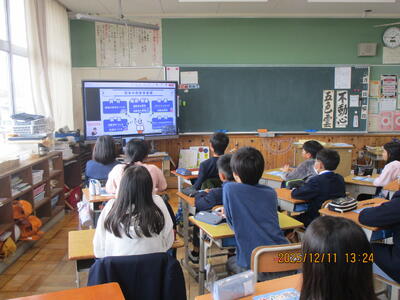 左下に、案内してくださるナビゲーターの方が小窓で映っていて、右下には、モニターに向かう5年生が映っています。