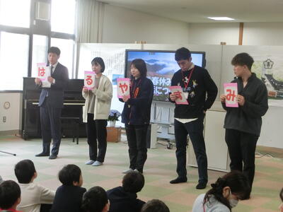 「はるやすみ」の5文字にかけて、「早寝早起き」「ルールを守ろう」「やろう学習」「すすんでお手伝い」「みんな元気に」という、お話です。