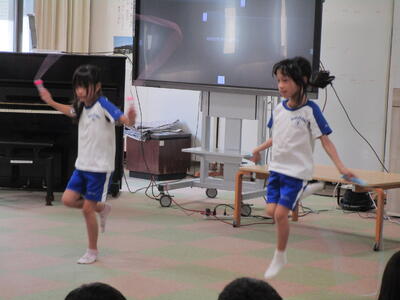 ペアでなわとびです。途中でひっかかることなく、いろんな技を続けて跳ぶことができました。