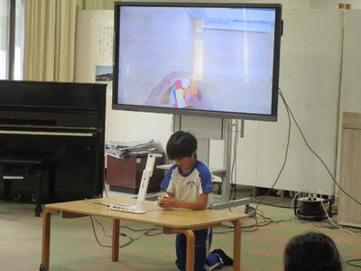 この取組は、本年度から始まった新しい試みですが、各学級の代表の子が、自分の得意なことを、みんなの前で発表してくれました。