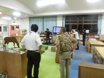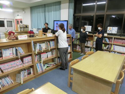 はじめに、この夏休み期間のうちに、改修した学校図書館の新しいカーペットを見ていただきました。