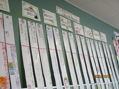 これは、国語科「たずねびと」を学習して、主人公の心情の変化を、場面ごとにまとめたものです。子どもたちが作った短冊によって、振り返りができるようになっていました。