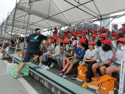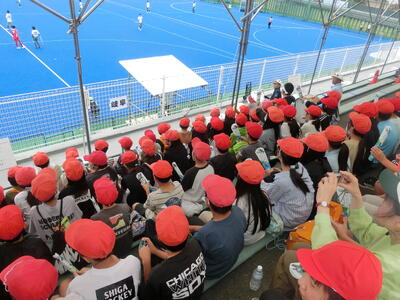 本日、国スポのホッケー観戦に4・5・6年生がOSPに行ってきました。島根県VS岐阜県の前半戦を観戦してきました。新木団長の掛け声に合わせ、みんなで一生懸命応援してきました。帰りに、島根の方から「みんな応援ありがとうね!」という声をたくさんいただくほど試合を盛り上げることができました。とても貴重な体験ができました。