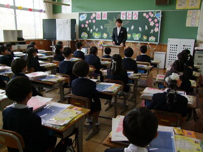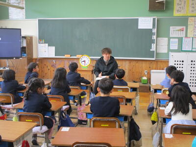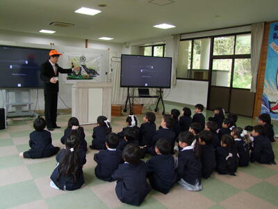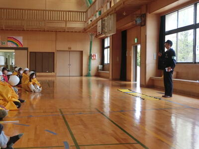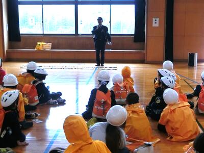 その後は、体育館に全校で集合し、近江長岡駐在所の警察官の方から、安全についてのお話を聞きました。
